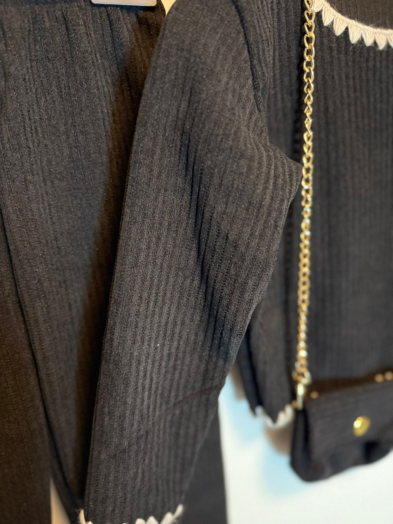 Deze vrolijke set is gemaakt voor kleine fashionista’s die van stijl én comfort houden! De zachte ribstof voelt heerlijk aan en de contrasterende randjes geven een speels accent. Het gouden kettinkje met bijpassend tasje maakt de outfit helemaal compleet — perfect voor een dagje uit of een feestje!