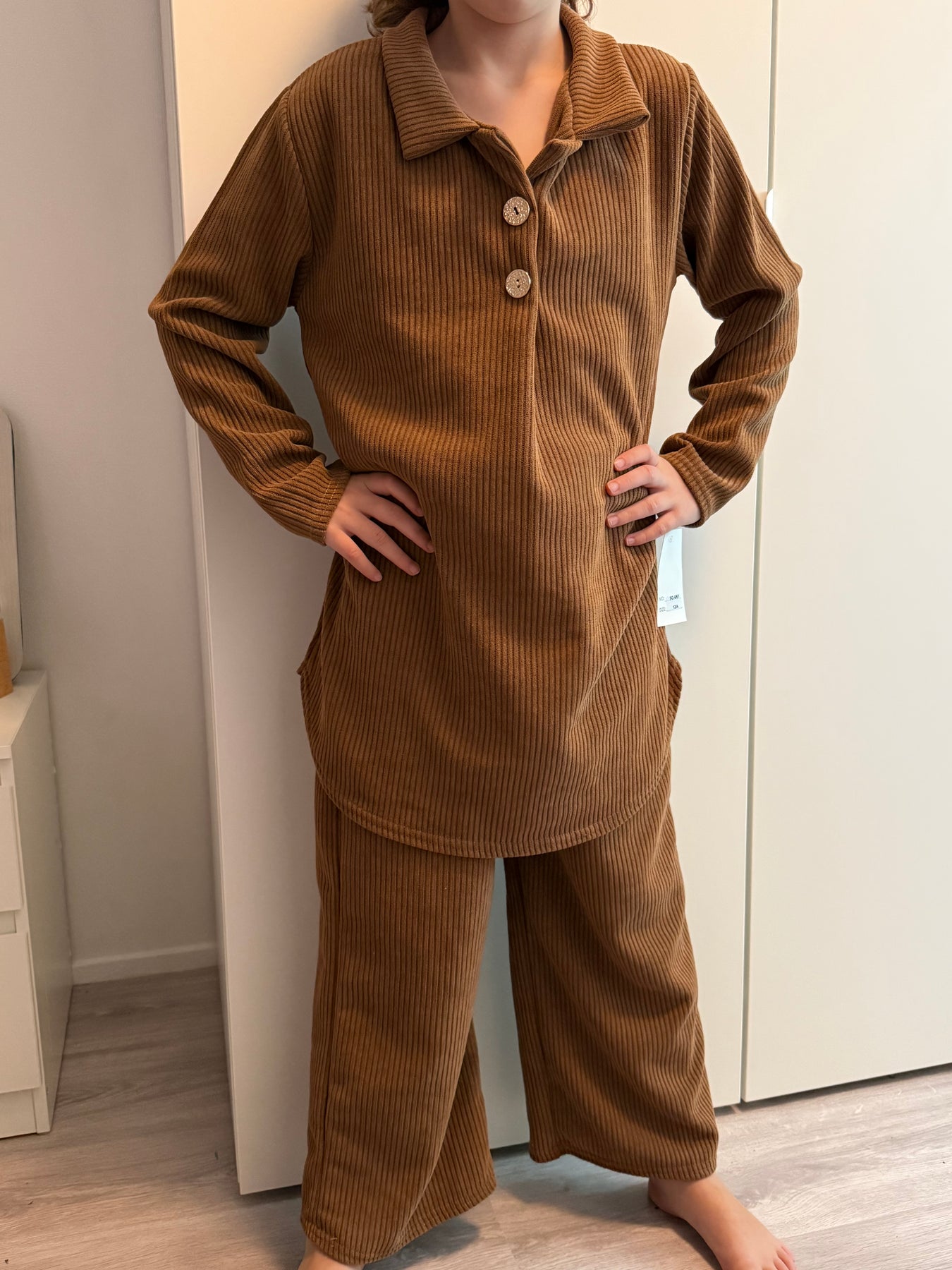 De set bestaat uit een lange mouw top met twee decoratieve knoopjes en een elastische broek met comfortabele pasvorm. De fijne ribstructuur geeft het geheel een tijdloze uitstraling en zorgt voor extra zachtheid tegen de huid.